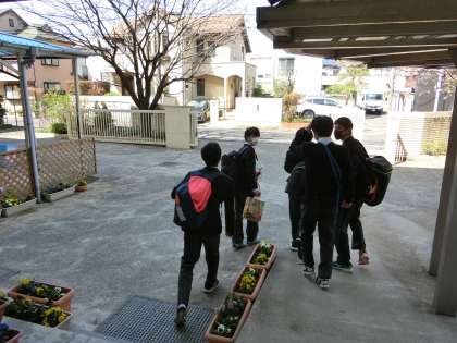 たくさんの荷物、最後の通知表をもたって3年生が下校しました。
