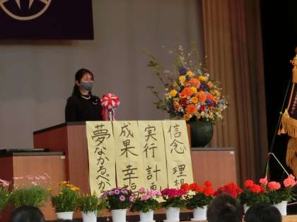 弦和会の志摩会長よりお祝いと感謝の言葉をいただきました。在校生代表の生徒会長より「卒業生を送る言葉」がありました。
