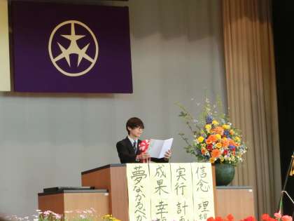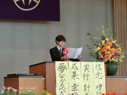 「日差しが日々柔らかくなり、春の訪れを感じる季節となりました。自宅から先輩方の門出をお祝いしている在校生全員を代表して送る言葉を述べさせていただきます。…」とはじまりました。短いあいさつの中に、先輩たちとの思い出、感謝の気持ちが込められていました。在校生代表として、たった一人で出席ありがとうございました。立派なあいさつでした。