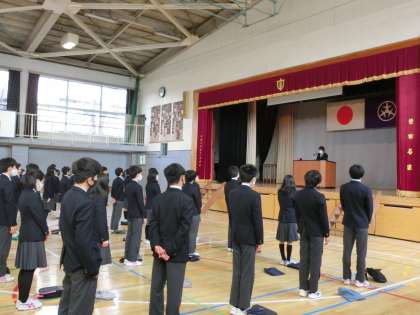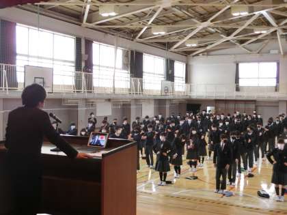 令和2年度最終日2 3月25日(木) 公開日 2021/03/25 更新日 2021/03/25 できごと 修了式は、2年生と!組が体育館で、1年生が教室でリモートで行いました。 まずは生活指導主任による整列指導です。 いいね(0)