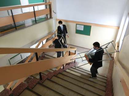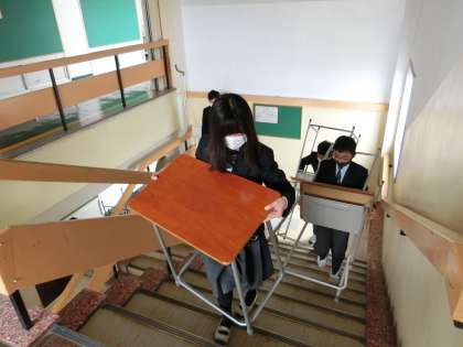 黙々と何度も机と椅子を運ぶ2年生の子どもたち。