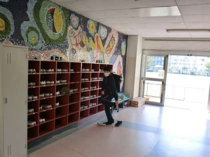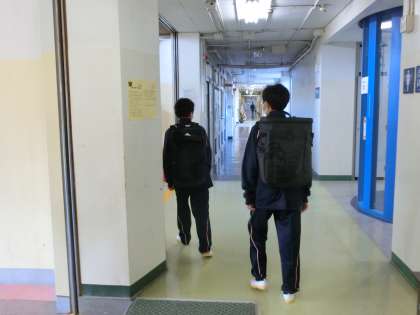 生徒が登校してきます。おそろいのカバンです。偶然!!