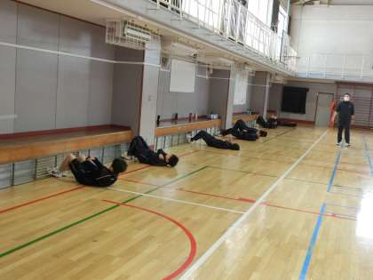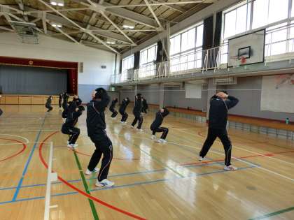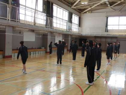 I組では初体育の授業でした。必ず授業のはじめに行う腹筋・背筋、スクワット…みんな頑張っていました。