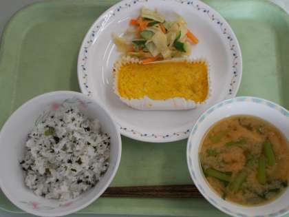 4月16日の給食 公開日 2021/04/16 更新日 2021/04/16 給食 今日は和食の献立です。 弦巻中学校の卵焼きはみじん切りにした野菜やひき肉を炒めた具材が入っています。 今日の献立 ・わかめごはん ・卵焼き ・野菜のごま風味 ・味噌汁 食材産地〔生鮮食品〕 人参:徳島 玉ねぎ:北海道 キャベツ:愛知 大根:千葉 きゅうり:埼玉 じゃがいも:北海道 小松菜:茨城 豚肉:青森 鶏卵:千葉・青森 いいね(0)