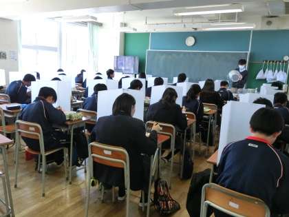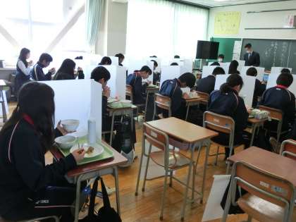 給食はパーテーションをして、放送委員の流すリクエスト曲を聴きながら食べています。