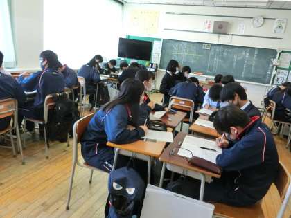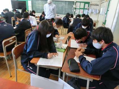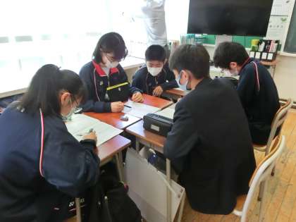 国語では、井上ひさし作「握手」について、グループでの話し合い活動をしていました。