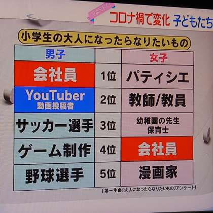 今日はこどもの日でした。毎年小学生がなりたい職業が紹介されます。今年は、男子の一位と、女子の4位に、なんと会社員が入りました。テレワークが増えて、家で仕事をしている会社員の親の仕事を見ていた子供達が憧れの職業に選んだのではないかと、テレビでいってましたが、どうなのでしょうか?