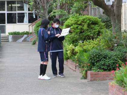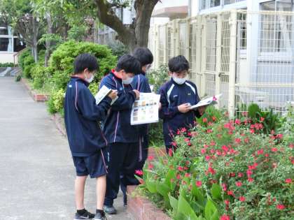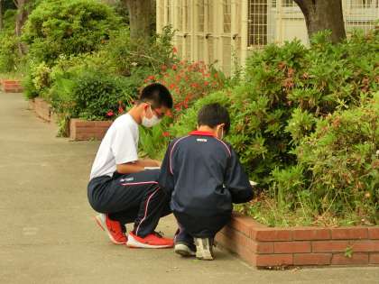 1年生理科の授業。校庭の草花、生き物の観察をしていました。