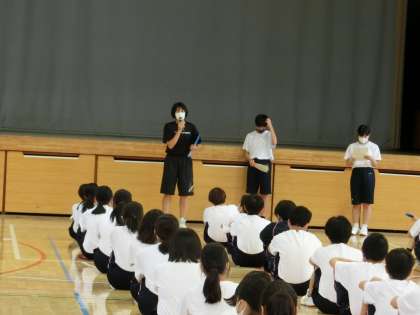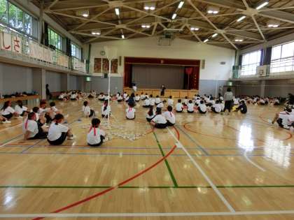 1年生とI組の学年練習2回目。あいにくの雨で、体育館で行いました。真新しい色別のハチマキを巻いて気合が入ります。学年練習玉入れが終わったところでした。