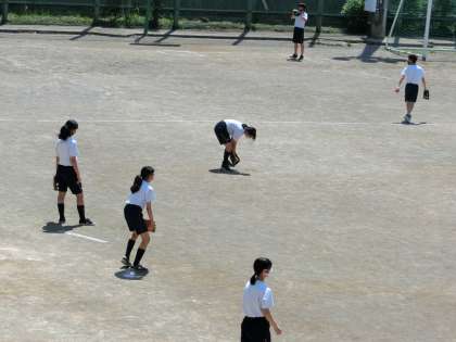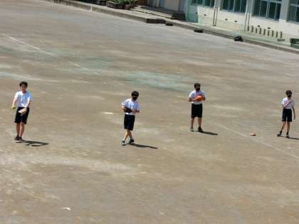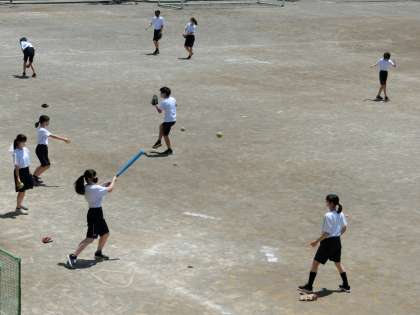 体育の授業。校庭でキャッチボールとバッティング練習。