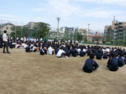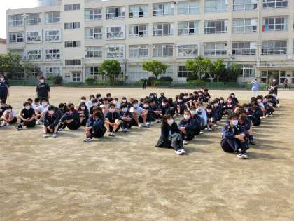 避難の放送から、全員の避難完了まで4分でした。集合した後も静かに次の指示を待っている姿、今年度はじめて校庭への避難があった訓練ですが、とても良かったです。校長先生からは2つのお話をしました。お話もしっかりと聞けました。