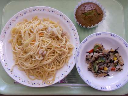 5月25日の給食 公開日 2021/05/25 更新日 2021/05/25 給食 抹茶ケーキには刻んだ甘納豆が入っています。 今日の献立 ・ツナと春キャベツのスパゲッティ ・大根とひじきのサラダ ・抹茶ケーキ 食材産地〔生鮮食品〕 にんにく:青森 玉ねぎ:兵庫 人参:徳島 キャベツ:東京 大根:千葉 きゅうり:埼玉 赤パプリカ:熊本 卵:青森 ベーコン:大多摩ハム いいね(0)
