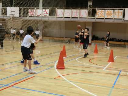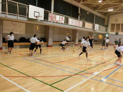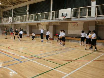 体育館ではバレー部、バスケ部練習中。
