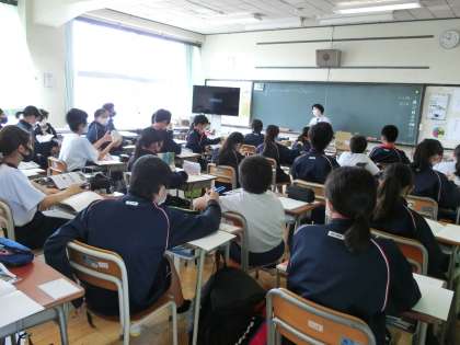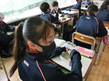 1年生の理科の授業です。さまざまな本物の鉱石に触れることができました。