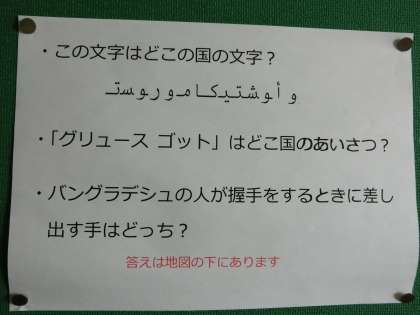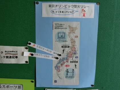 去年から生徒会室の前にオリパラコーナーがつくられました。世界おともだちプロジェクトの国や、聖火リレーのこと、面白いクイズもありました。
