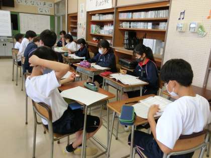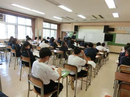 1年生音楽。楽譜を書いています。ミニ先生誕生。