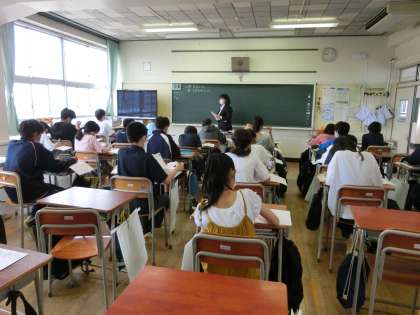 田中先生の数学の授業。多くの先生方が参観にきていました。文字式の学習です。小学校の算数から一歩前進。文字を使う式を勉強します。