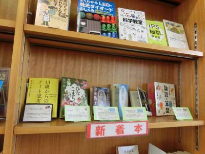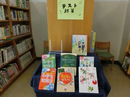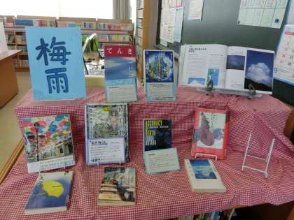 図書室には、「テスト対策」「梅雨特集」「新刊本コーナー」がありました。