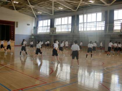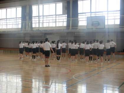 2年生体育。バレーボールの授業です。男女共修で田中先生が指導中。