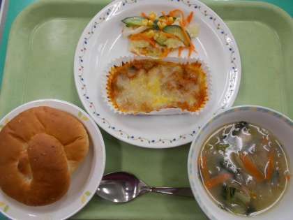 6月16日の給食 公開日 2021/06/17 更新日 2021/06/17 給食 16日の献立 ・セサミパン ・かぼちゃのグラタン ・コーンフレンチサラダ ・野菜スープ 食材産地〔生鮮食品〕 かぼちゃ:鹿児島 玉ねぎ:愛知 人参:千葉 キャベツ:茨城 きゅうり:埼玉 白菜:長野 セロリ:長野 小松菜:茨城 豚肉:青森 鶏肉:岩手 いいね(0)