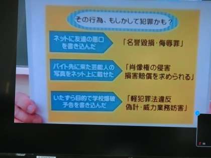 セーフティ教室9 6月25日(金) 公開日 2021/06/25 更新日 2021/06/25 校長室より また、最後に被害者ではなく、加害者になってしまう場合、犯罪になってしまう場合についても学びました。便利で楽しいSNSを使って、犯罪に巻き込まれるだけでなく、犯罪を起こすことのないように正しく使っていきましょう。 次に薬物乱用防止について、組織犯罪を担当している警察の方からお話を聞きました。 いいね(0)