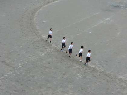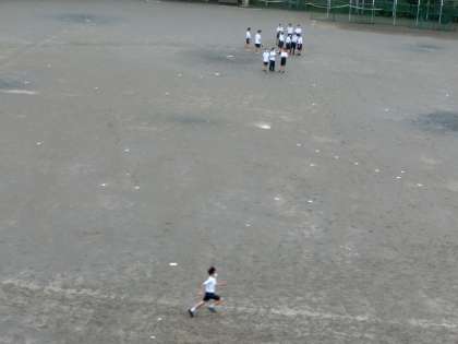 鉄道研究部、校庭では、小雨の中陸上部活動中。