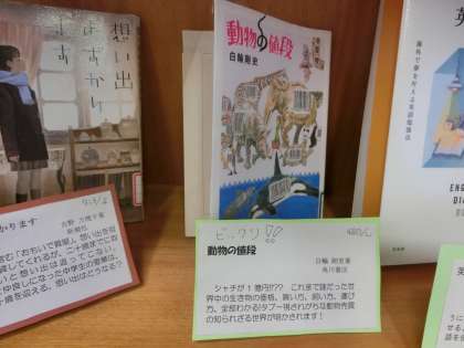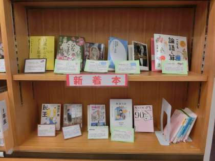 図書室の新刊コーナー。図書室を利用してください。いっぱい本を読もう。