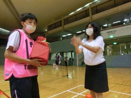 閉会式は、記念品を校長先生から3年生の代表者2名がもらいました。