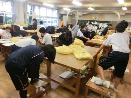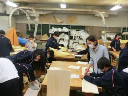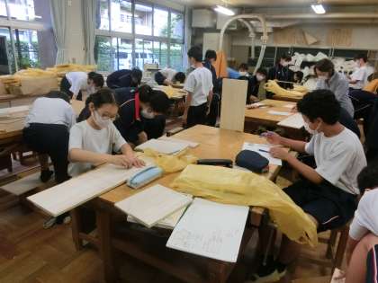 1年生、木工作品製作。一枚の板から作るのは初めてですね。