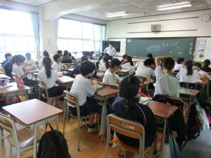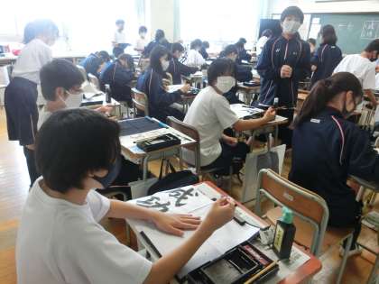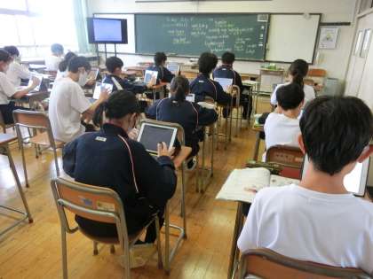 1年生習字の時間。英語では、マイタブレットで「キュビナ」に取り組んでいました。