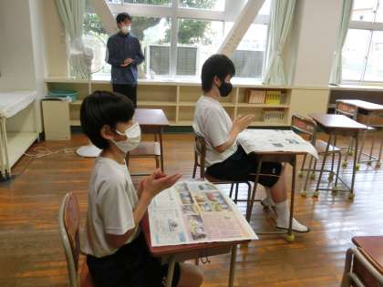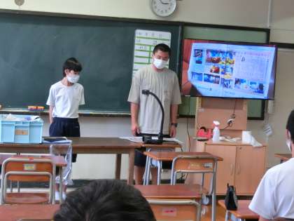 2年I組、自分の選んだ新聞記事をみんなに発表中でした。