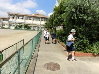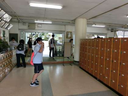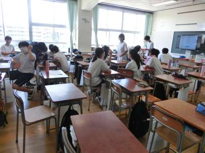 班ごとに学校に戻ってきました。終わった人から、参加賞をもらって、ワークシートを完成させています。