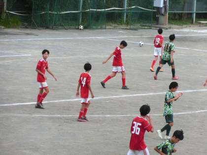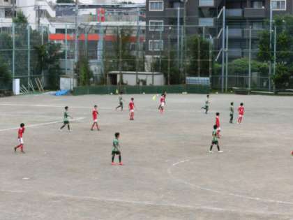 サッカー部校庭で区内のサッカーチームとの練習試合中です。
