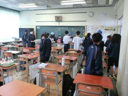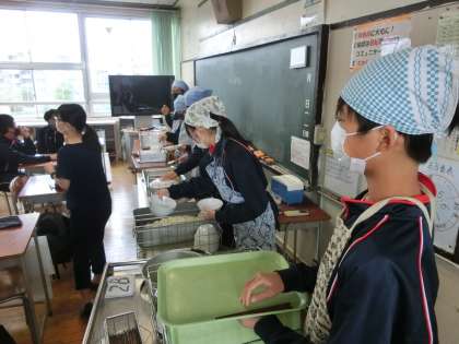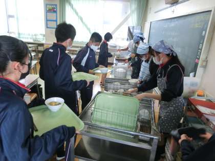 黙々と給食準備を。給食当番は、自前のエプロンと三角巾をしています。
