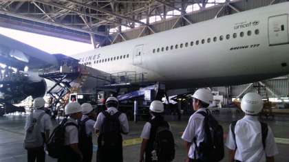 ヘルメットをかぶって見学しています。目の前の飛行機はボーイング777です。