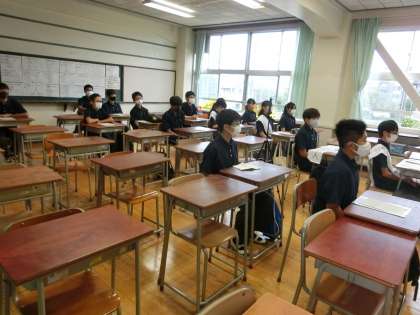 9月13日の生徒会本部役員選挙に向けて、2年生の立候補者・応援者が集合しました。分散登校でも立会演説会ができるように、準備していきました。