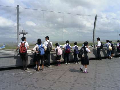 展望デッキで飛行機の発着陸を楽しそうに見ています。