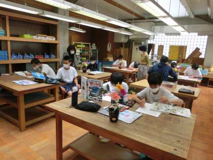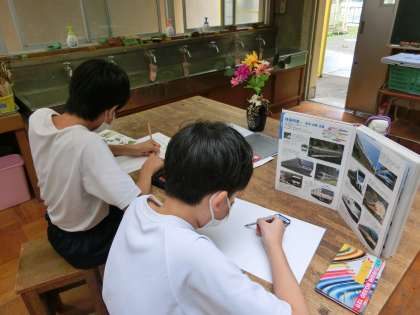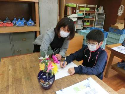 I組は美術の授業。静物画や図鑑を見ながら絵を書きました。