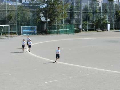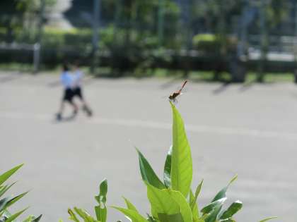 3年生男子。頑張って走っていたら、校長室の前の木にトンボが止まりました。