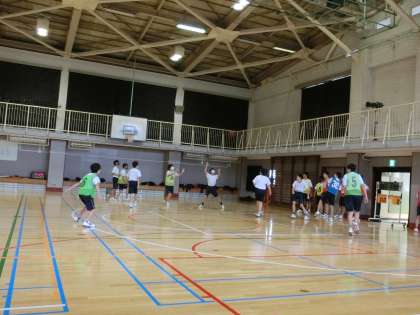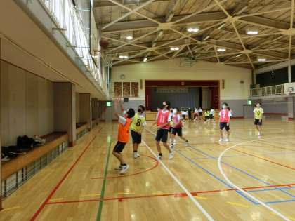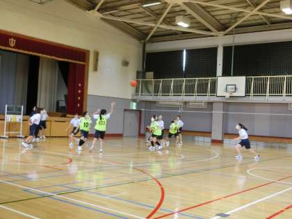 体育館でバスケットボール。みんな一生懸命ボールをおいます。