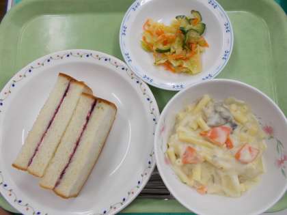 11月9日の給食 公開日 2021/11/09 更新日 2021/11/09 給食 今日は久しぶりのサンドイッチでした。 ブルーベリージャムを塗ったパンとバターを塗ったパンを合わせたサンドイッチになっています。 今日の献立 ・ジャムバターサンド ・マカロニのクリーム煮 ・野菜のイタリアンドレッシング 食材産地〔生鮮食品〕 にんにく:青森 玉ねぎ:北海道 人参:北海道 キャベツ:茨城 きゅうり:高知 鶏肉:岩手 いいね(0)