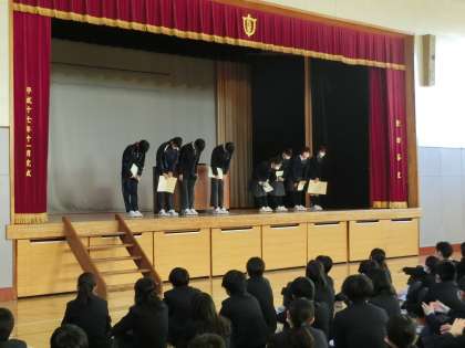 生徒表彰1 公開日 2022/01/11 更新日 2022/01/11 校長室より コロナ禍で全校朝礼も全員でできなかった表彰。2学期の終業式に表彰しました。 世田谷区子ども駅伝大会に優郷の学び舎チームが男女ともに優勝しました。 いいね(0)