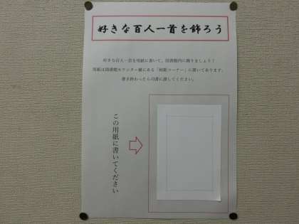 図書室にて3 1月14日(金) 公開日 2022/01/14 更新日 2022/01/14 校長室より 廊下には六歌仙の紹介の新聞記事が貼られていました。また好きな百人一首を飾ろうのコーナーもありました。 私の好きな百人一首は「天津風 雲の通い路吹き閉ぢよ をとめの姿 しばしとどめむ」です。 いいね(0)