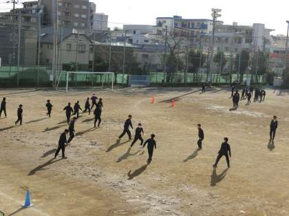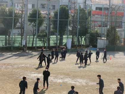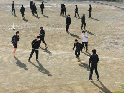 1時間目、校庭でサッカーの授業。良い天気で気持ちよさそうでした。