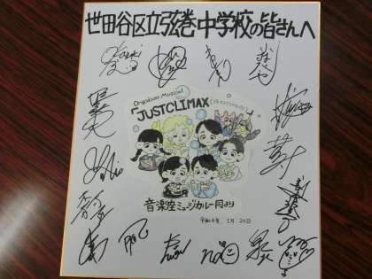 音楽座ミュージカル 1月24日(月) 公開日 2022/01/24 更新日 2022/01/24 校長室より 20日(木)の公演のあと、色紙をいただきました。ジャストクライマックスまた見たいです。 2月12日・13日で青山の草月ホールであります。 いいね(0)