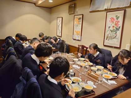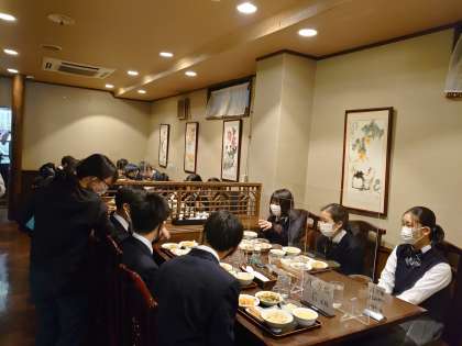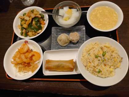 昼食A組集合。市場通りの醉楼さんにお世話になっています。中華料理は大皿に盛り付けられるのがいいところですが、感染症対策のために、一人一人小皿にしてもらってます。
