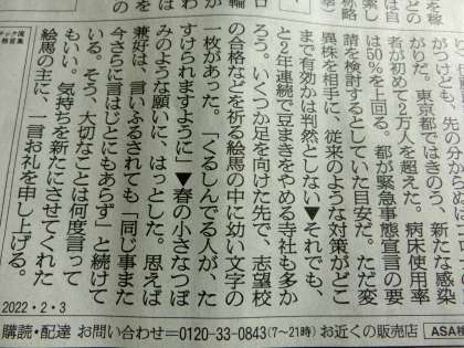 「天声人語」節分の日にちなんだ記事だった。後半のエピソードにほっこりしました。