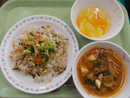 2月9日の給食 公開日 2022/02/09 更新日 2022/02/09 給食 今日の献立 ・ビビンバ ・豆腐チゲ ・フルーツポンチ 食材産地【生鮮食品】 にんにく:青森 生姜:高知 長ねぎ:千葉 豆もやし:栃木 人参:千葉 白菜:群馬 しめじ:長野 ニラ:栃木 小松菜:茨城 豚肉:群馬 いいね(0)