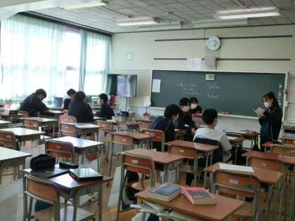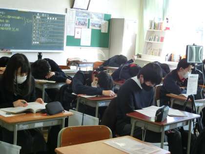 3年生の教室は、だいぶ人数が減りました。オンライン授業に参加中ですね。家でも頑張って勉強してください。最後の都立入試が来週です。