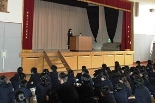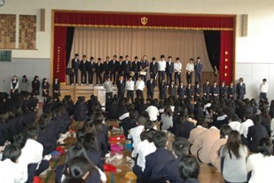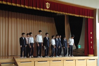 10月12日(水)、体育館にて全校朝礼が行われました。校長先生からは、I組の河口湖連合移動教室の様子や生徒会の議案書などについてお話がありました。河口湖では学級紹介のダンスやカレー作りなど、今までの練習の成果をしっかり発揮できたことを紹介していました。生徒会の議案書については「目標」についてのお話がありました。「目標」がモチベーションを高めるための「スローガン」にならないように気をつけ、努力すれば達成できるような具体的な「目標」をたて、達成できたかどうかをしっかりと評価してほしいというお話がありました。また、先日行われた連合陸上大会と陸上部の表彰が行われました。代表選手と陸上部の皆さん、おめでとうございます。最後に生徒会から弦中フェスタのボランティア募集の呼びかけがありました。興味のある人は是非、参加してください。